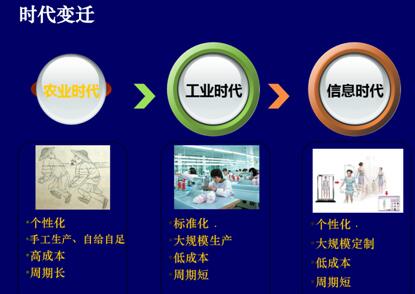 还有一个潜在的模式创新,即从B2C,C2C走向C2B+O2O,C2B+O2O是什么样的服务模式?我们所谓的固定靶的射击是大规模的生产,福特通用汽车最早引用的流水线生产模式。再到下一步大规模的生产走向定制,以戴尔模式为代表的挑战了微软和英特尔的模式,这是移动靶的射击。最后一步走入了是空中飞碟,个性化的定制,就是我们所倡导的C2B模式。