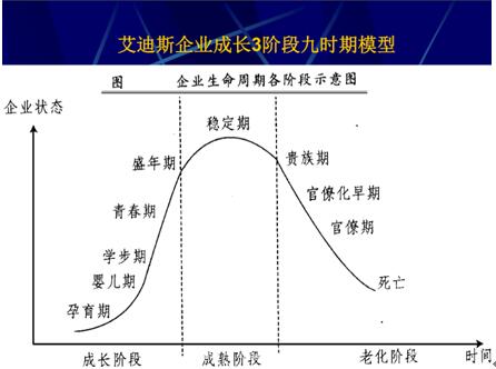 在过去两百多年的工业革命历程中,很多企业都在探索自己要活多长时间,想延长自己的寿命。但是很遗憾,无论是日本、美国还是英国的企业,平均寿命只有30-40年。下图是艾迪斯企业成长3阶段9时期模型。