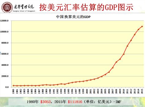美元汇率计算GDP,下图是中国1980年以后中国与美元换算GDP,通过曲线可发现,中国GDP速度增长还不错。从1980年到2015年,GDP平均增长速率为10.84%,平均6.74年翻一番。