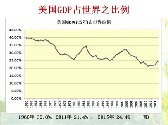 下图是中国与美国GDP占世界比例的变化情况,中国在1987年是1.59%,2015年14.8%,但仍然没有达到中国人口占世界人口的比例,人均GDP也没达到世界的平均水平。美国GDP占世界之比例,1960年39.8%,2011年21.4%,2015年24.4%。