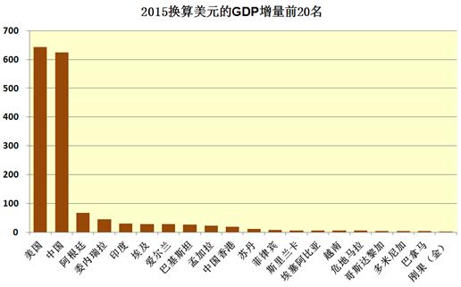美国的增速虽然比中国低,但增量却是第一。2015年GDP增量前20名的国家如下图所示。