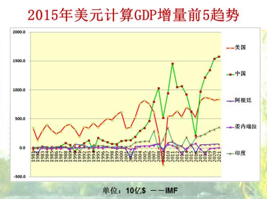 下图是2015年美元计算GDP增量前五名,绿色的是中国,红色的是美国。2006年以前,中国增量超不过美国。2007年之后,特别是美国有一次负增长,中国才超过来美国。最近两年美国可能超过中国,但是这是按照国际货币基金组织的预测,过几年中国GDP增量还会超过美国。