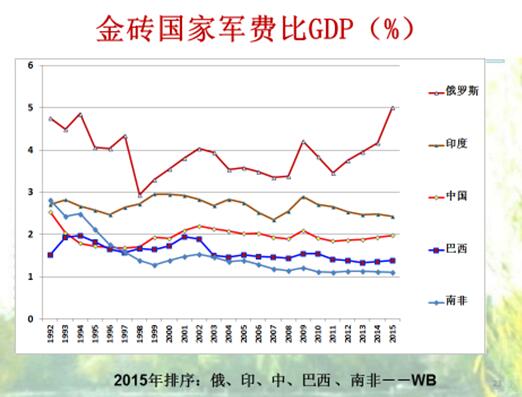 G7与中国军费占GDP比重,美国是4%、5%,金融危机以来下降了一点,中国是2%上下,日本是1%,比例没怎么变。这是金砖国家,俄罗斯最多,4%、5%,然后是印度,然后是中国。