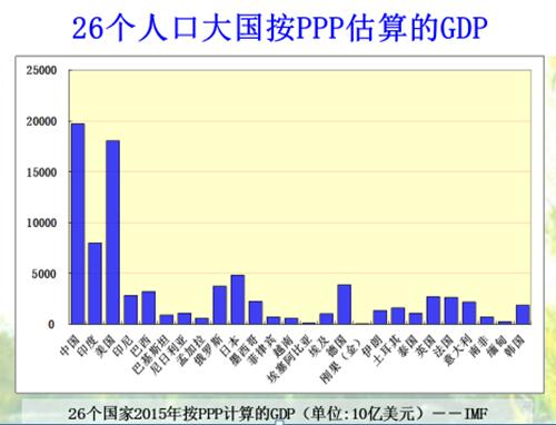 按购买力评价GDP,它更能客观的衡量一个国家的财富。但是有一件事要知道就是世界上超过五千万人口的国家有26个,泰国刚过五千万,中国13亿多,印度12亿多。下图就是26个人口大国按PPP估算的GDP,中国超过美国已经成为第一大经济体。