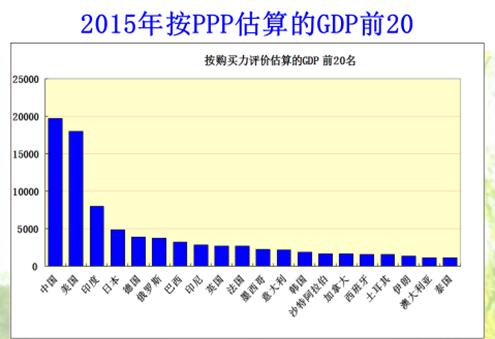 按照2005年的购买评价计算,中国GDP是2011年开始加快的,但后来并没有热捧中国,因为115个国家的估值上升,平均升幅为31.2%,中国提升的是20.7%,印度是32.8%。这是2015年按PPP估算的GDP前20,印尼,除了金砖国家之外,最后一个是泰国。