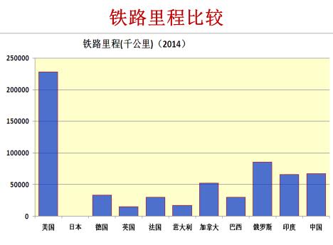 在铁路里程方面,中国和印度差不多,比俄罗斯少,美国最多。铁路货运量,中国和俄罗斯差不多,美国少一点。但是铁路单位里程货运量中国最多,客运量印度比中国多。但是客运单位里程印度最高,其次是日本,然后是中国。