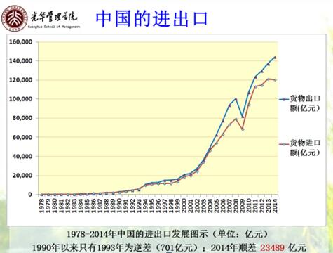 看经济国际化比较。中国多年来出口大于进口,而且金融危机之后下降了,顺差在扩大。中国的出口世界第一,进口是世界第二,进出品总量全世界第一。