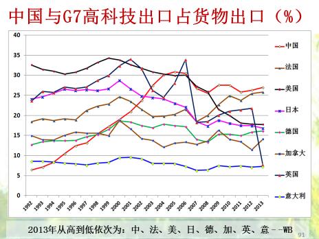 在高科技产品出口占货币比例方面,与金砖国家比,中国一直是最高的。如果和G7比,好多年前中国比例是最低的,现在成了最高的。ICT产品出口占货物出口的比例,中国也是最高的。