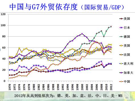 中国内地外贸依存度,依存度进出口总额除以GDP,依存度越高,跟世界联系紧密,他们感冒,我们就打喷嚏。下图是中国与G7外贸依存度比较。