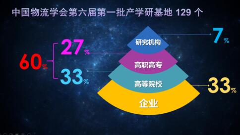 首先,我们来盘点产学研的工作。中国物流学会第六届第一批产学研基地共129个,其中高等院校和高职高专高等占比60%,企业占比33%,研究机构占比7%。