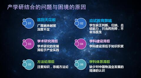 目前,产学研结合的问题与困境的原因很多,如产学研结合广度越来越宽,深度不足;,应试教育的疲软越来越明显,学生到企业去了之后最大问题是真的会考试,真的会背,但是不会干;学术研究滞后,其实研究应该走到应用的前面来,但是我们有些研究甚至跟政策一样是走在了市场的后面;学术研究滞后,注重知识,忽视方法论;学科体系滞后等等。