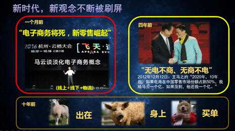 我们真正需要的产学研结合是什么样的?我想先从企业和行业的角度来看,我们面临的趋势是什么?十年前,我们做企业做得比较好的时候,互联网出现了,告诉我们羊毛出在猪身上,狗买单。然后找我们提供免费服务,还真有人提供免费仓库,我们想跟上,但没跟上。2012年出现了“王马之约”,说到2020年时,将“无电不商,无商不电”;可到了2016年的10月13日马云在云栖大会上却讲电商将死,新零售崛起。这世界变得太快了,真把一些企业弄晕了。