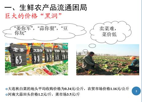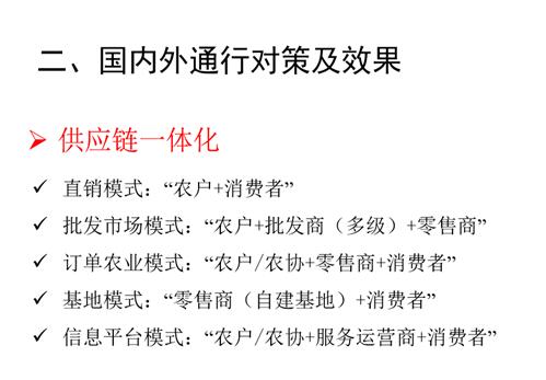 一是农超对接。亚太地区采取农超对接的比例超过70%,美国达到80%,但是在中国只有15%左右。主要原因包括进场费障碍、农超位置不对等、农超信息不对称,农产品标准化程度不够,这些都是妨碍农超对接模式在中国推行的因素。