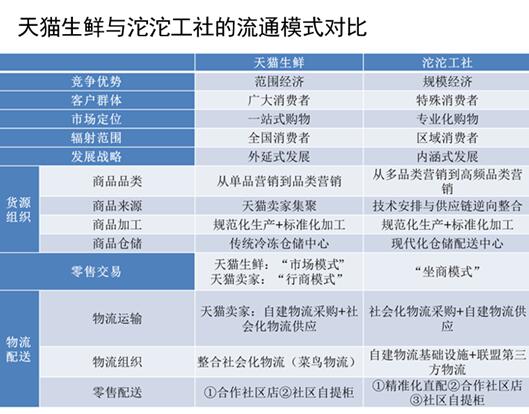由于模式不同,天猫和沱沱工社在货源组织、零售交易和物流配送等方面也不尽相同。