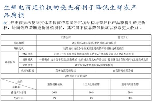 生鲜电商定价权丧失有利于降低生鲜农产品腐损。生鲜电商无法复制实体零售商依靠垄断市场结构与差异化产品获得生鲜定价权,进而依靠垄断定价补偿损耗,不得不依靠降低损耗以获取更大的收益。
