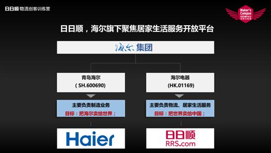 日日顺是海尔旗下居家生活服务开放平台。海尔集团下面两个大公司,一个是青岛海尔,它主要负责制造业,现在怎么样把传统的家电变成电器,打造一个“智慧+”的平台。另外一个是海尔电器,这个是香港的上市公司,主要提供复流,居家生活服务的平台,目标把世界卖给中国。日日顺就是在整个香港公司旗下。