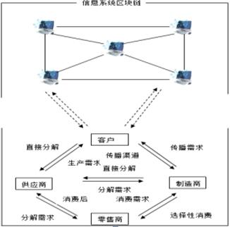 区块链在物流供应链信息生态圈中有着很重要的应用,其中客户、供应商、制造商、零售商的供应与需求信息通过分解与传播直接作用信息系统区块链,然后信息系统再对客户进行反馈,如下图所示: