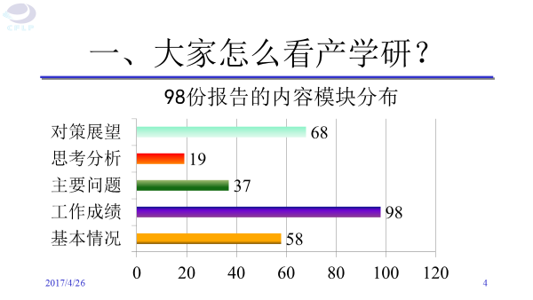 这个分布,我觉得是有代表性的。第一,报告中基本情况可长可短,甚至可以没有。第二,成绩要展现出来,所有报告中成绩都是重点展现内容。第三,小部分单位总结报告涉及到产学研存在的问题,但是多数没有涉及到。更少一部分单位会将问题展开,对这些问题作进一步思考。第四,很多报告对下一步工作安排都有说明,但大部分报告中单位工作、对策展望与问题无关,只有小部分有联系。这就是提供报告的基本情况。