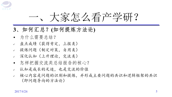 第一类以成绩盘点为主,用于上报获得表彰。第二类是提炼问题,是自己用的,主要是要看下一步怎么干,找问题,制订对策。第三类交流探讨,如一起开会要交流,主要是要谈认知是怎么深化,怎么发现问题,怎么分析问题的,怎么解决问题的,而这些是最有用的。只有你的能力、逻辑、视角和方法是对别人有用的,我们交流才有意义。所以我们写总结一定要分清楚做什么,可以成绩为主,可以问题为主,也可以以认知的深化或者方法论为主。但产学研结合工作会,比较适合总结一年产学研工作中,我们解决了哪些问题,这些问题怎么被发现的,怎么被总结出来的,后来我们怎么通过各方的努力甚至博弈把它解决掉,解决掉以后它的适用范围如何,局限性如何,这些应是产学研会交流的主要内容。产学研结合工作会要有高质量的交流内容,核心应以问题为导向,找到产学研工作当中的存在问题究竟是什么,并能够把它梳理成为一个简单的框架,能够为大家所共识。如果大家都可以这样做,产学研工作就可以进一步深化。否则,交流难以达到共识,产学研可能长期停滞不前。所以这类的交流会,我认为应该是问题导向,我们需要有一个问题导向的思想方法,来取得共识、来进行交流、来进行合作,这是这个产学研结合工作会需要解决的。