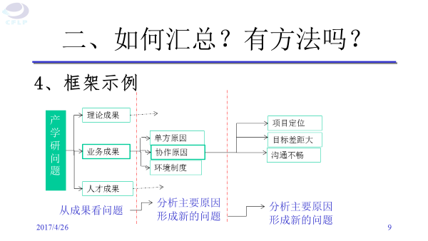 例如,产学研的一个问题是没有标志性成果,我们就把成果进行分类和分层。产学研应该有3个成果,理论成果、业务成果、人才成果。然后,沿着成果可以展出一些相关的成果问题。比如业务成果,有各种各样的原因造成的与之相关的原因,可能是单方面的原因,如企业问题、院校问题;也有可能不是单方面的,是学校、企业多方在协作的问题;也有可能是制度问题,这就不是2、3家就能解决的。这样一分类,可能就把问题的原因分析出来了。沿着这个思路就去研究自己怎么办,关系怎么办,制度怎么办,去识别这三类问题。那么每一个问题再往下深入一步,就又作为一个问题导向的开端,再往下分。例如,研究协作不好,存在问题,什么问题呢?项目定位、目标差距太大还是沟通不畅,这就又可以展开。把碰到的问题放在这个框架里面,这个问题就一点点的逐步深入。只要掌握了问题导向,学会了分类,分层,这个框架很容易搭建起来。