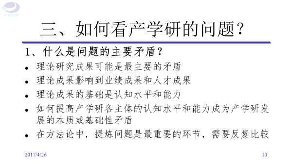 我要向大家交代一下我怎么看产学研存在的问题。我的看法仍然是问题导向,要想进一步推进产学研,就要找到问题所在。什么是主要矛盾呢?我第一个看法,理论研究成果可能是主要矛盾。换句话说,我把产学研中“研”放在第一位,作为主要矛盾。当然这是一个可能,我不太确定。因为这个信息量还少,大家反馈意见还少。但是我觉得有道理的。因为理论的成果会影响到业绩成果和人才成果。也就是说,理论研究不行,产学研就失去了对于实践和人才成果的指导。而实践成果的解决,很大程度上取决于谁掌握了理论研究的这些方法。企业如果掌握,自己能够解决,如果不掌握需要院校解决,如果院校也不掌握,那就会失败。所以看来,如果我们把这个“研”字——追求理论上的总结和提高,放在了产学研关系中的一个主要矛盾上,我们可能会理顺一些碰到的问题。我们现在缺少标志性的成果,可能会有很大的改观。而理论成果的基础是认知水平和认知能力。所以,我认为产学研的主要问题是要解决学校、企业、研究院以及所有参与单位认知能力和水平的问题。那么,产学研所取得的成绩,只是验证研究成果是否成功,总结的理论是否正确。而提高认知水平,需要方法论。在整个方法论框架中,提炼问题是最重要的环节,是要花很长时间去比较,去提炼,去反复。遗憾的是:我们今天没有能力到这个环节,就是怎么去提炼的问题,我们今天只是说提炼问题很重要,我们今天可能无法去讲到怎么去提炼。