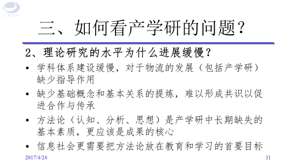 (3)产学研的问题在于理论研究水平的制约,进而说明各主体的方法论缺失是问题的基础原因。