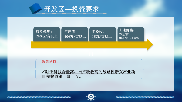 另外我们园区有12公里的深水海岸线,离岸200-300米以上,就有达14米以上水深,可以通行10万吨级船舶。此外我们园区基础设施非常完善,提供九通一平的基础条件,并且已经全部实现供热,周边就有热电厂。另外污水处理厂、企业服务中心等等方面也应十分完善。