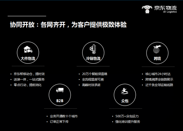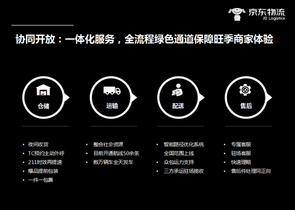 协同开放:一体化服务,全流程绿色通道保障旺季商家体验。京东有六张大网,中小件网、大件网、B2B网、冷链网、跨境网、众包网。首先讲讲京东在传统中小件网络中的创新。在仓储方面,我们在收货端开通了夜间收货,同时跟商家进行系统打通,商家可以在我们的系统里提前预约。比如要送货到京东13号库,可以提前预约13号库哪个时间段是空的,然后直接送货。物流人都知道,集中送货仓库是没有办法收货的,给商家带来了非常大的困扰,所以夜间收货好处很多。今年“双11”,当天峰值单量比去年翻了一倍多,但是京东85%的包裹在11日23点59分之前到了下游的分拣中心,有95%的包裹在第三天就已经到了消费者手中,第四天绝大部分配送点恢复常态运营。这些都基于在物流配送方面的巨大创新。比如我们有一个智能路径优化系统,商品或包裹到了站点后,派件员会把这些包裹输入到PDA系统里,PDA根据实时路况选择最优路径,告诉配送员第一点送哪儿,第二点送哪儿,这样新入职的配送员可以在很短时间里达到与经验丰富配送员一样的配送效率。