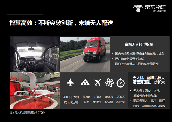 智慧高效:不断突破创新,末端无人配送。京东一直在做无人车和无人机。无人机在局部地区已经实现了常态运营,大概已经起飞了1800多次。无人配送车已经在一些高校投入运营,同时我们还和上汽大通、东风汽车一起研发无人轻型货车,未来将会成为干线的重要载体。从无人仓、无人车、无人机三个角度来说,无人机和无人车技术是最成熟的,无人仓技术还在爬坡阶段。但是从运用角度来看,无人仓实施更加容易,因为无人机、无人车还受到中国很多法律的限制和国民素质的限制,无人机和无人车大规模运用还需要很长时间。京东会大力推无人仓,目前京东有13个亚洲一号,有不同程度的自动化设备,未来我们会把无人仓里的不同环节应用到不同仓库中。