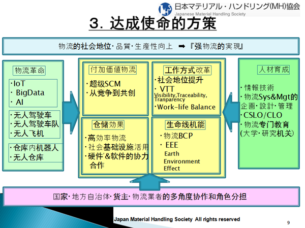 一是要提升物流业在社会上的地位。要进一步提升日本物流业的发展质量,提升整个生产效率。我们要通过物流革命和人才培养达到,采用更多的信息技术,采用更多的软件管理(包括物流的系统和管理的软件),采用一些先进的设备,和大学、研究机关进行更多的合作,搞好产学研结合。比如要进一步给物流业带来更多的附加值,这方面要融入到一个超过供应链管理的框架中。还有要从竞争到共创,要实现这样路径。