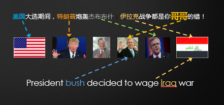 这里面牵涉到伊拉克战争、美国大选两件事,涉及到三个人,必须要让计算机准确地理解这句话的含义,才能准确翻译出来。再来举个例子,“爸爸举不起他的儿子,因为他很重”,“爸爸举不起他的儿子,因为他很虚弱”,“他”指的是谁,必须让机器翻译理解。这就是人工智能的一部分,整个过程实际上涉及到了很多的技术合成。