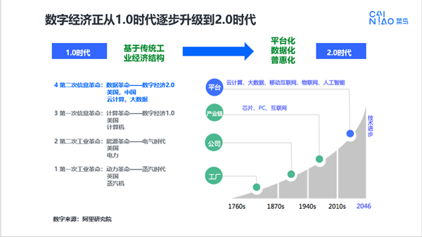 经济变革从历史上来看有四次:一是蒸汽机时代,二是工业革命,三是以计算机为代表的信息革命,四是数据革命。目前,数字经济正在从1.0时代向2.0时代发展,现在数字经济2.0具有平台化、数据化和普惠化等特点。