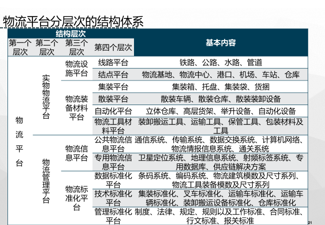 物流平台向物流运行提供直接支撑的工程和管理系统,是由信息网络、实物网络设施共同构筑的,包括包括物流设施、物流装备、信息平台和物流标准化体系等。