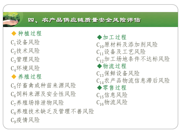 张倩教授认为,虽然我国农产品总体监测合格率较高,但农产品质量安全隐患依然存在,农产品供应链各环节质量安全风险因素主要表现在以下几个方面: