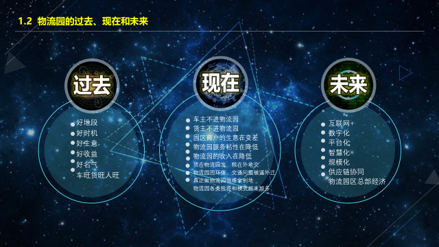 以前,物流园区处于一个非常幸运的时代。物流园区只要能建立起来,就不愁没有货流、车流和人流,可以用“滋润”两个字来形容。但现在的物流园区发展碰到了一些问题,如车主不进物流园,货主不进物流园,园区商户的生意在变差,物流园区服务粘性在降低,物流园区的收入在降低,货在物流园区发、税在外地交,物流园区因环保、交通问题被逼外迁,真正做物流园区很难拿到地,物流园区各类投资和模式越来越多等。这个问题既有互联网时代的冲击,也有经济下行带来的压力。但在共享经济时代,物流园区应更多考虑的是思变,怎么转型、怎么创新,突破眼前的困境,适应时代发展。