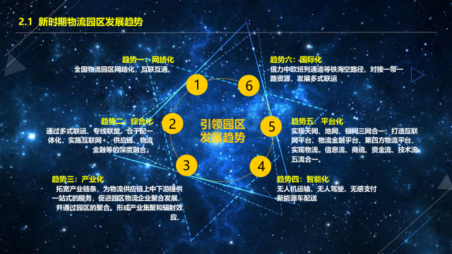 新时代物流园区发展一定要遵循以下六个趋势。第一是网络化,怎么样让物流园区互联互通,这是园区发展面临的重要问题。共享经济要求我们把门打开,把腿迈出去,才能找到新的机会;第二是综合化,要通过多式联运、专线联盟、仓干配一体化,实施互联网+、供应链、物流金融等的深度融合,寻找园区的新的增长点;第三是产业化,目前物流园区是做停车和生活配套等,已经不能适应时代发展需求,我们一定要与当地产业相结合,没有产业支撑的物流是没有灵魂的。第四是智能化,怎么将新科技应用到物流园区的服务场景中。第五是平台化,如何通过平台化,实现物流、信息流、商流、资金流、技术流的五流合一。第六是国际化,只有适应国际化的发展,参与到“一带一路”建设,物流园区才能有更多机遇和红利。