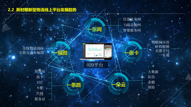 对于线上的物流平台,应建立“五个一”。首先是一张网,这张网不仅是信息交易平台,而是要把仓干配的物流网络也搭建起来,把物流后市场服务网络也搭建起来,同时把智慧技术融入,形成线上线下联动。第二是一张卡,这张卡可能是实物或是虚拟账户,这张卡能够通过物联网应用,实现供应链里面的一体化服务,从物流的交易到后期结算形成一整套体系。第三是一朵云,怎样利用大数据,利用征信体系、金融体系,支撑供应链、物流园区和线上平台发展。第四是一条路,怎样围绕高速公司和车辆,提供更多的增值服务,比如油卡、ETC、汽修等。第五是一幅图,全国物流园区互联互通布局图。线上平台只有与线下园区相结合,两条腿走路,才能跑得快。