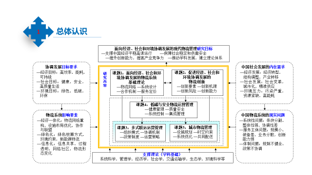 主要从五个方面展开:第一是面向经济、社会和环境协调发展的物流系统基础理论;第二是增强国际竞争力的物流创新机制设计与创新能力提升策略;第三是衔接国际与国内物流的多式联运系统运营管理与战略设计;第四是追求“安全-质量-健康”的物流系统安全与低碳运营管理;第五是适应城镇化进程的特大城市物流运营管理、评价与政策设计。这个问题的提出主要是因为有四个方面的变化,第一是目标变化,第二是对象变化,第三是手段变化,第四是规制变化,由于这些变化才产生了这个重大的研究问题。