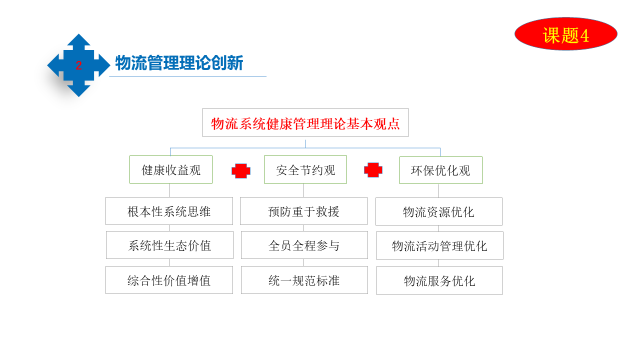 主要是以“资源节约型、环境友好型”可持续发展物流管理理论创新为主线来拓展理论成果应用领域。这里包括五大核心理论体系:第一是物流创新理论;第二是绿色物流管理理论;第三是多式联运物流运营管理理论;第四是物流系统健康管理理论;第五是城市物流管理理论。我承担的课题是物流系统健康管理理论,我把这部分内容展开和大家详细汇报。