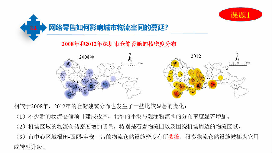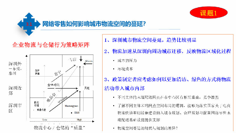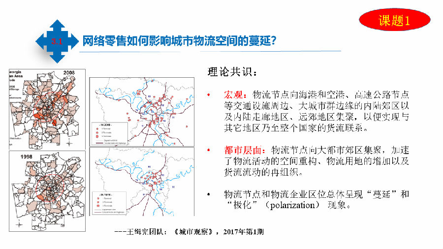 下面就每个课题的实践成果和大家做一个汇报。课题1研究成果:网络零售如何影响城市物流空间的蔓延?物流蔓延的问题不仅是发生在中国,在国际上也有。如图可以看到,随着网络零售的发展,物流系统的变化。从宏观和都市层面的研究,实际上是物流系统在一个层次或一个区域发展的生态。