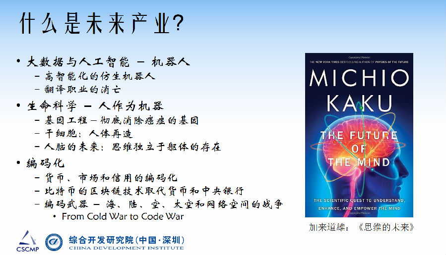 这本书是《思维的未来》,我最近又买了他写的《人类的未来》。这本书讲述了未来我们为什么不能够去火星,因为物流成本太高,每一公斤四千万美元。这本书写到,未来我们脑科学发展,可以把思维下载,然后通过激光上上传到外星,人的灵魂和躯体可以独立存活。