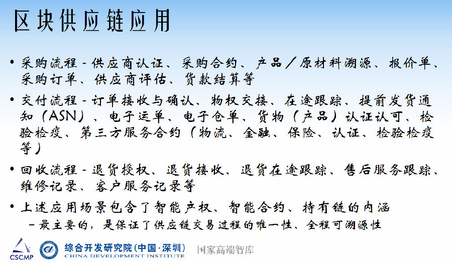 最近两年,区块链越来越多在供应链领域中应用,产生了很多的应用场景,包括计划制造、采购交付和回收等,我们都可以看到区块链应用的案例。例如,如何将多个结算方、多种单证通过区块链形成自动执行的程序来提高交易效率,利用区块链使仓单可以不再重复质押。区块链上升到2.0版本后实现智能合约,让整个供应链的运行方式具备了更高效率的工具。