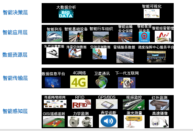 高铁发展核心思想是不断提高服务质量,智能高铁系统总体可划分为五个层次:智能感知层、智能传输层、智能资源层、智能应用层、智能决策层。智能高铁技术主要包括:智能客运、智能列车、智能基础设施、智能调度指挥、智能安全保障、智能养护维修、智能工程建设。