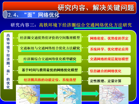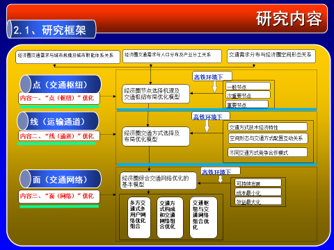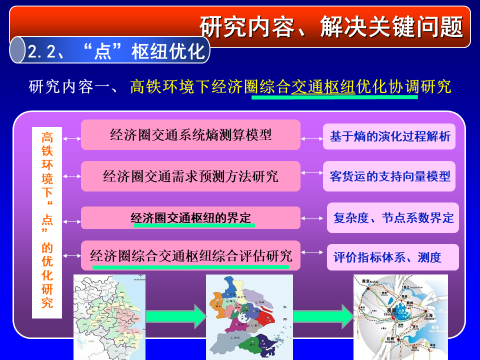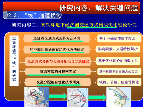 研究内容和研究结果均从“点、线、面”三个方面进行介绍。交通枢纽优化中主要介绍了综合交通枢纽优化协调研究的模型及预测方法,给出了综合评估,得到了交通需求总量及分布模型、交通枢纽的界定方法、交通枢纽的评估模型;通道优化中主要介绍了交通方式选择方法以及分担率的界定,得到了不同交通方式竞争合作模式以及交通方式布局优化模型;网络优化方面,运用了交通网络优化模型和组合优化方法,得到了综合交通网络结构优化模型,完善了交通网络资源优化配置理论。