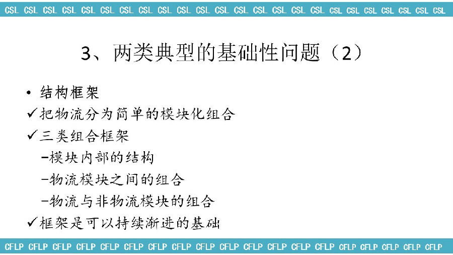 第二个问题就是不会搭建框架,抓住了好问题,但是框架没有梳理好,结果走错了路。任何一个系统都是由模块化组合出来的,方法论要构建模块化组合的框架。框架有三类的组合,一个是模块内部结构,你把它讲清楚,因为模块基础非常重要,它是一个系统发展的起点。第二个模块之间的关系组合,第三个就是物流与非物流模块的组合关系,大体上这个框架无非就是这么几类。我们有些物流模块是相对比较成熟的,比如说物流选址问题,理想情况下其问题清楚、解法清楚、答案清楚。还有路径优化问题,也是在一些明确的前提下,一个已经清楚、可以解决的模块。还有安全库存,也是一个比较成熟的模块。但实践中,这些问题总是搅和在一起,没有人可以说得清楚。什么情况下能够把他们揉在一起,揉在一起的关系分几类,为什么能分这么几类,他们有没有解,有没有统一的解等等。把框架构建清楚以后,研究水平就体现出来了。即使没有答案也没有没关系,它是整个体系建设的一个阶段,因为它会引导大多数人研究继续往前走,否则我们永远没有方向。所以,搭建框架非常重要,过程比结论更重要。我们要研究思维是否清楚,是否理性,是否科学,是否有根据做支撑,这样可以保证研究比较扎实。后人可以踏着你的肩膀继续往前走,类似的工作不需要再做,你就做出了奠基的贡献,科学研究就是这样走过来的。