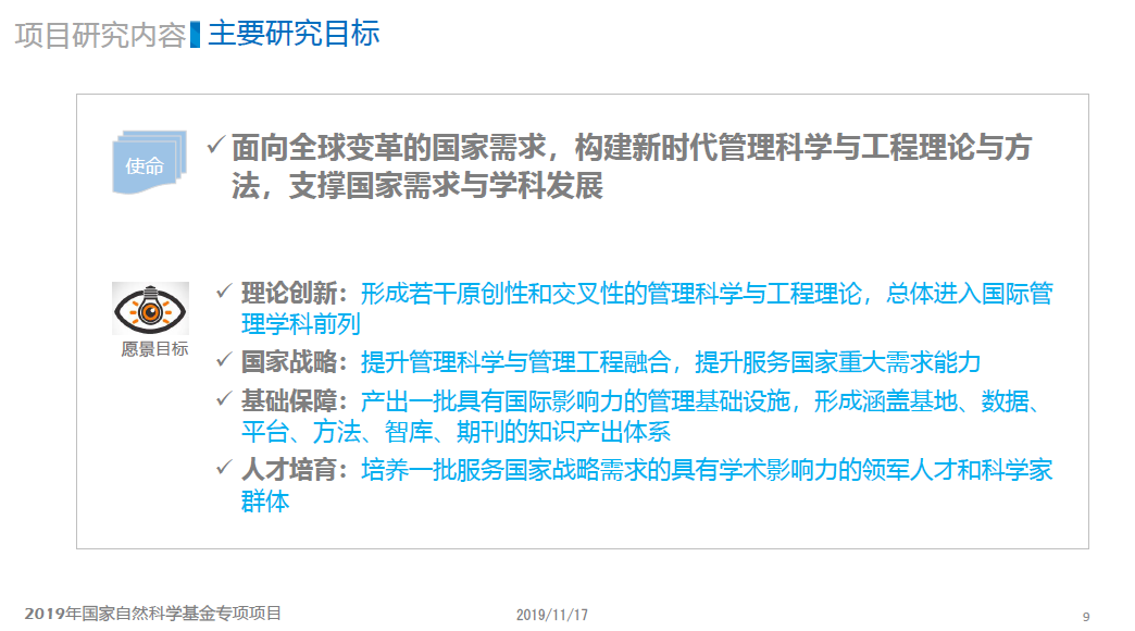 管理科学与工程作为管理科学部下设学科,共有19个子方向。主要研究内容包括:学科发展规律、学科发展目标、学科布局优化、学科交叉情况、优先资助领域和相关政策措施六个方面。
