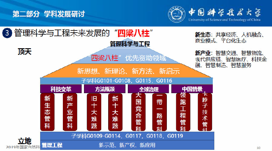 基于新时代中国特色社会主义思想和NSFC基金改革资助方针,我们充分认识管理科学与工程学科发展现状和面临挑战与机遇,确定学科发展目标和使命,提出学科发展特有的“四梁八柱”和布局体系。