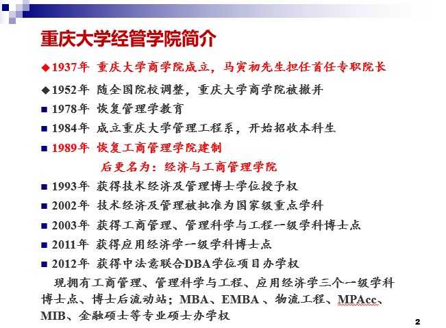 但斌副院长先介绍了重庆大学经济与工商管理学院的发展历程,然后分享了经管学院当前面临的问题和矛盾:第一,专业过多过细,现在更强调厚基础宽口径,给学生搭建平台,创造未来发展空间,而不要限制在某个专业上。第二,升学和就业的矛盾,大部分学生本科毕业后选择就业,只有一部分选择升学或者出国。第三,生源结构问题,由于重庆大学以工科为主好就业,吸引了很多贫困地区的学生报考,导致了大部分学生毕业后不会选择继续深造。第四,引进国际化人才的渠道不畅,由于地处西部不发达和工资待遇等问题,很难吸引高端人才加入。