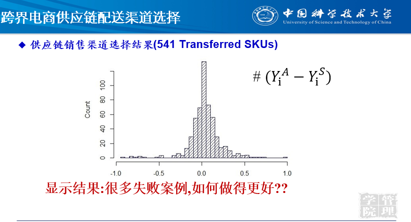 我们看一下企业决策的现实情况,很多企业追求在Amazon平台上选择FBA模式进行销售,显示的结果是什么呢?在Amazon平台卖一个产品的收入和通过企业的仓储系统进行配送所得到的收入两者进行相减,得到的值在横坐标0在右侧就表示从FBS向FBA转移是成功的,在0左侧就表示从FBS向FBA转移太盲目了,图中可以看出接近一半的商品向Amazon平台的转移是失败的。