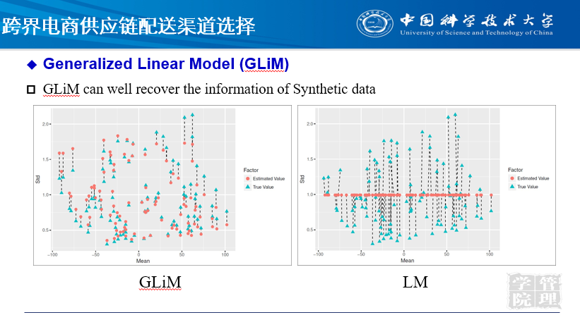 我们应该如何选择跨境电商供应链配送渠道呢?我们做了大数据数值分析,把两个平台的成本和收益进行分析,分析之后得到这种决策问题。下图右侧部分是传统预测的方法,是按照一个平均销量去做的,但很难去跟踪真实的需求预测。真实的需求预测方差很大,不停的在跳动。我们基于平台大数据开发的方法,像下图左侧部分,可以比较精确地知道下一步整个市场需求会往哪个方面进行跳动,我们进行实时捕捉,然后再提供给企业进行决策。最终的结果是这个企业的平台相关产品的收益可以提升到30%以上,较线性回归模型和决策树模型表现更优。